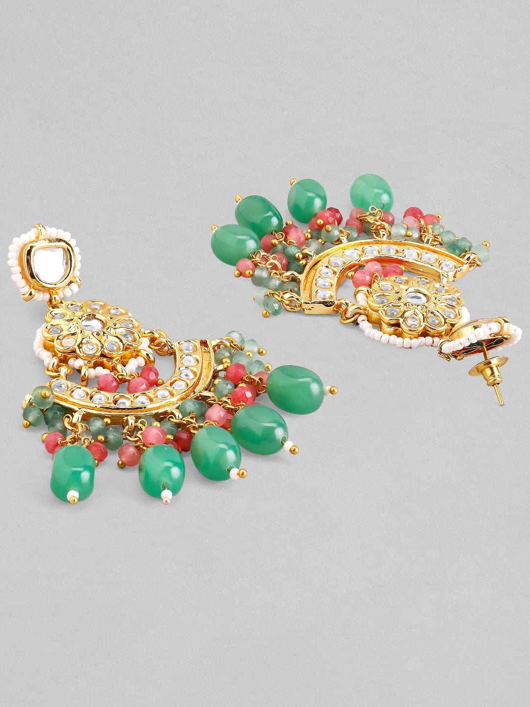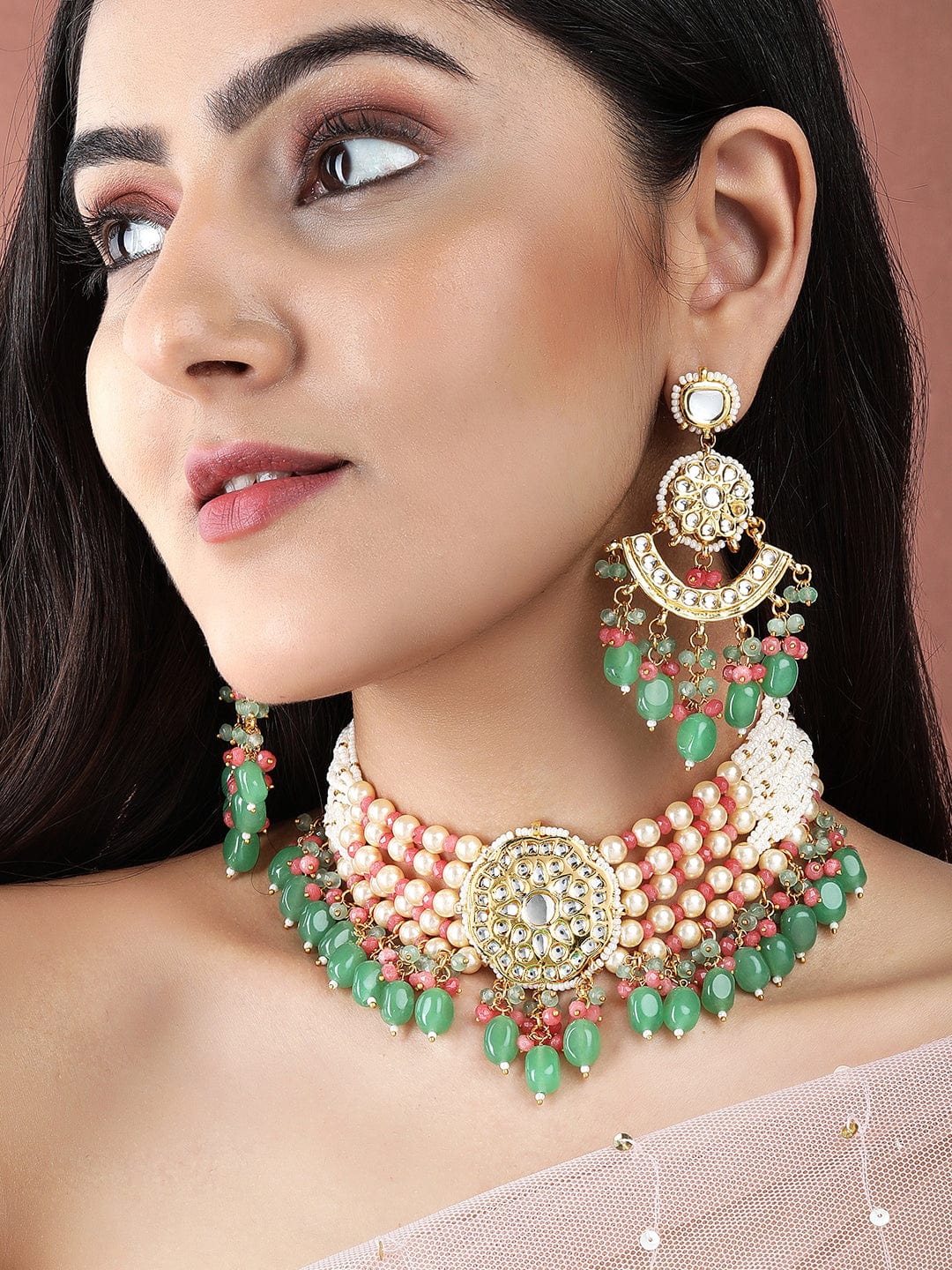 Luxury Gold Plated Green & Red Beaded Kundan Necklace Set